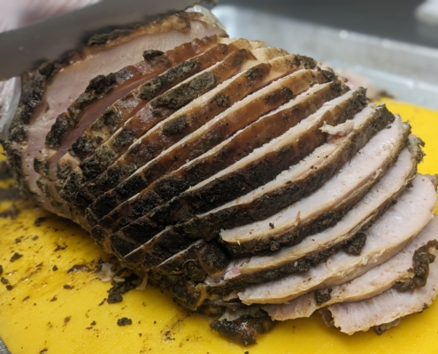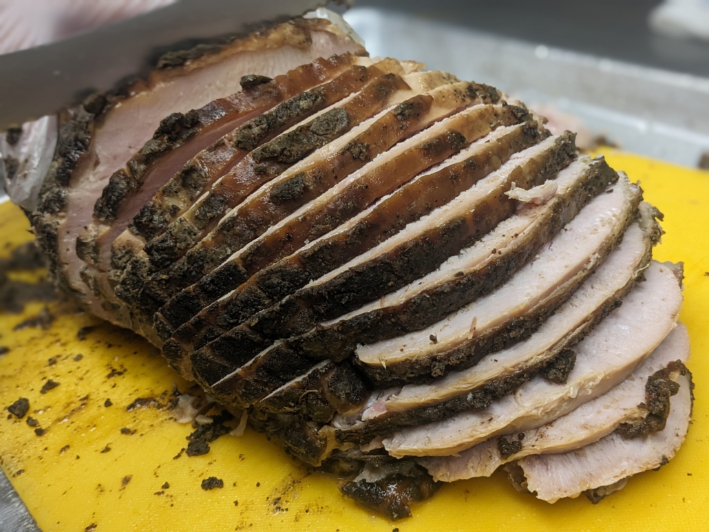 SLOW SMOKED TURKEY BREAST-These super juicy, smokey, healthy breasts have become an Extremely Popular Item every single Friday. Usually sells out by 2pm because of its growing popularity…..and is a MASSIVELY popular item come Thanksgiving time. They run about 8lbs (we do not control the sizes…..so no size queens pick up day!!!) final after smoking weight. We only sell them WHOLE…….so none of this “I’ll take 3 pounds of turkey” crap….Ha.